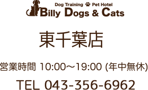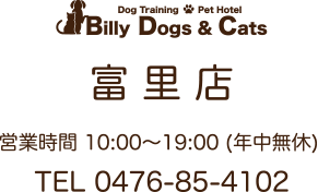 Billy Dogs & Catsは千葉県内にある成田市・富里市エリアを中心とする富里店、四街道市・佐倉市エリアを中心とする物井駅前店の2店舗があります。どちらもフリースペースを設けており、様々なワンちゃん達が一緒に遊んだり、お勉強をしたりと沢山の社会化を学べるようになっています。